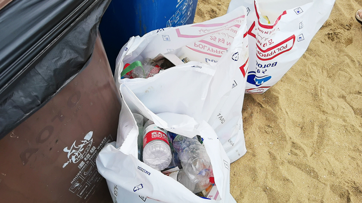 在现场,有经过时间的积累后深埋在沙地里的蛇皮袋;有晒得发白的烟头;更多的是游客肆意丢弃的塑料饮料瓶。