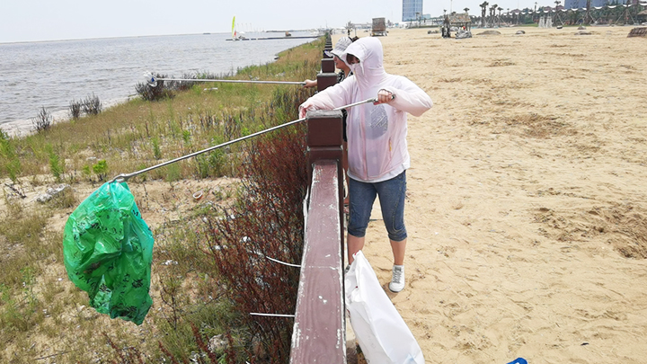 活动当天,久连员工头顶烈日炎炎,但是这丝毫不影响大家的热情,分工合作,或用长杆拾取禁止踏入的临海区域,或用竹夹拾取沙滩上的烟头。