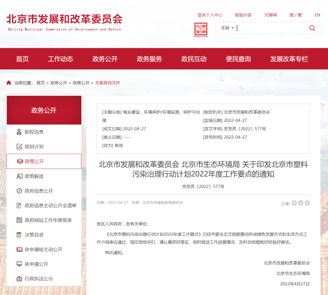 近期,北京市发展和改革委员会、北京市生态环境局印发《北京市塑料污染治理行动计划2022年度工作要点的通知》。
