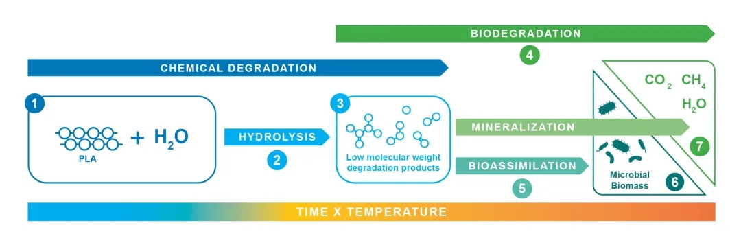 PLA 降解机制:在水 (1) 存在下,PLA 会发生水解 (2),这是一种纯化学的聚合物降解过程,在此过程中会产生低分子量中间体 (3),例如低聚物和乳酸单体。这些中间体会变成可溶性物质,并可进行生物降解 (4)。微生物会将这些低聚物和单体作为食物 (5),并利用它们形成生物质 (6) 和作为新陈代谢的能量。最终,这会导致原始聚合物碳矿化 (7),变成二氧化碳、甲烷和水。