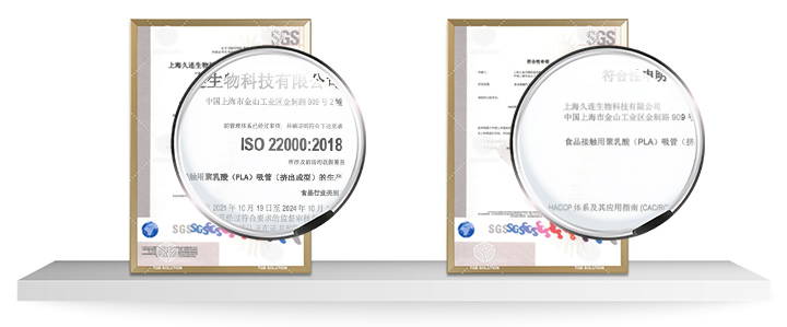 久连生物生产的PLA聚乳酸吸管现已获得ISO22000:2018食品安全管理体系认证和HACCP体系认证。从原料采购、食品生产、设备操作、物流运输等等内容严格控制保证每一个关键环节都是安全可控的状态,不仅形成了完善的质量监控体系,而且所有产品都已实现“可追溯”。