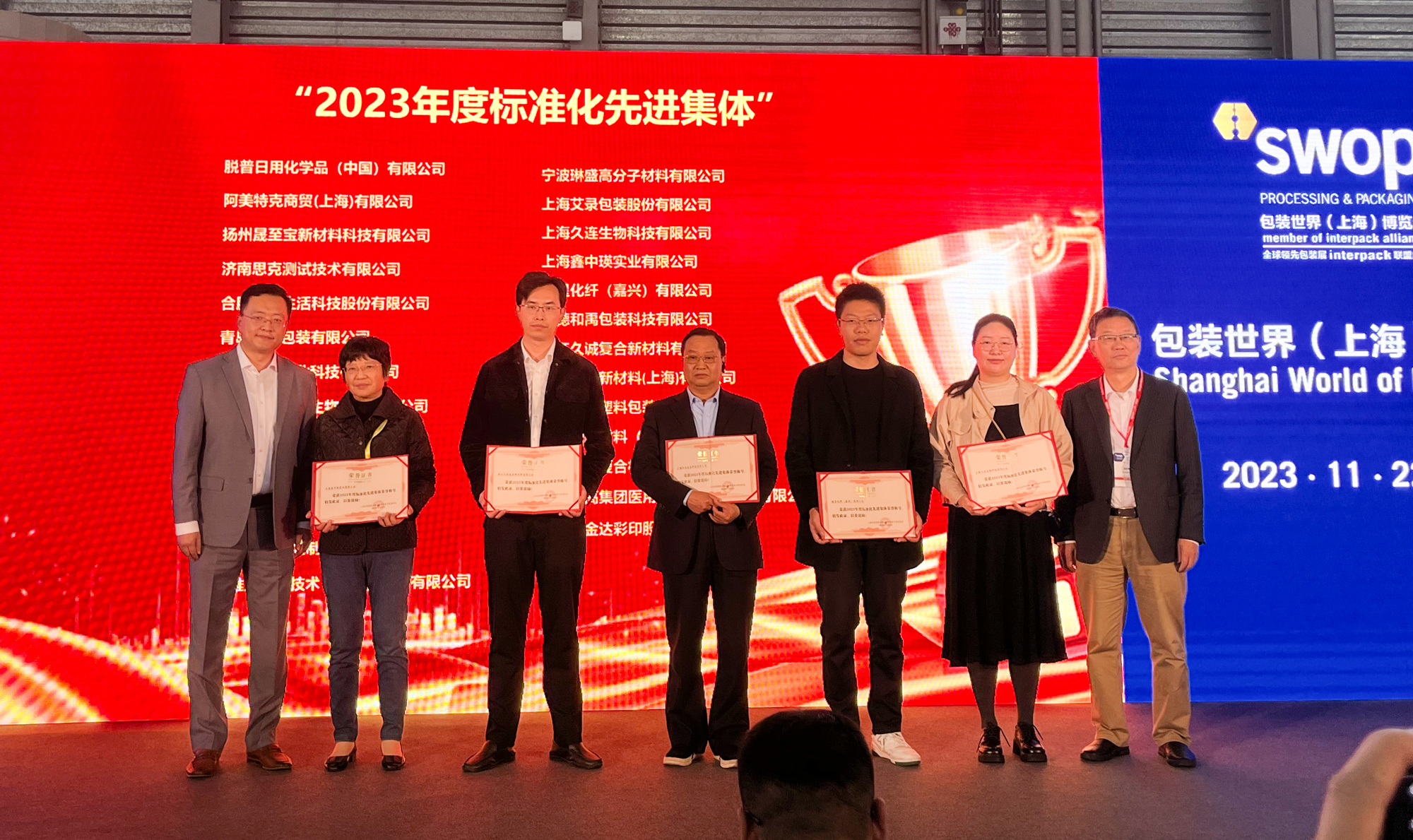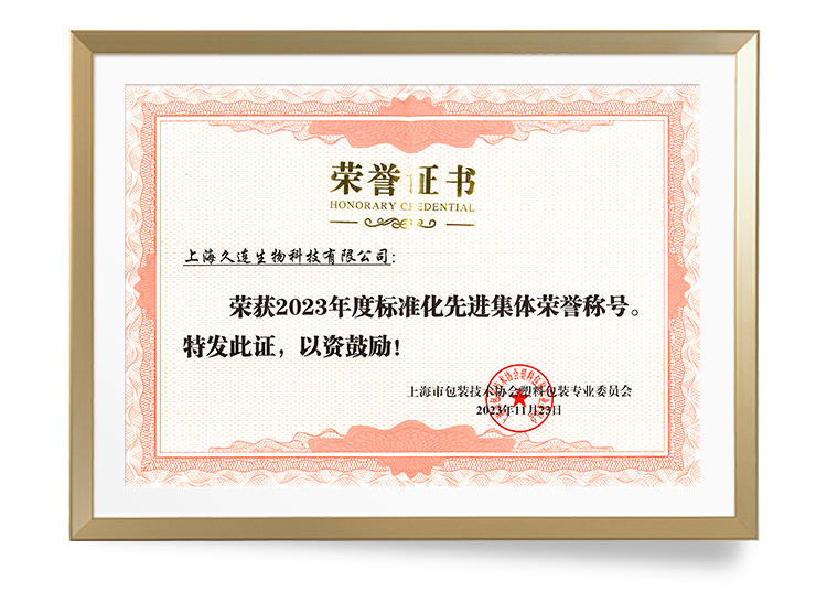 2023年11月23日,久连生物受邀参加《2023上海包协塑包委标准化工作年会暨标准宣贯表彰大会》,并荣获了由上海市包装技术协会塑料包装专业委员会颁发的《2023年度标准化先进集体荣誉称号》。